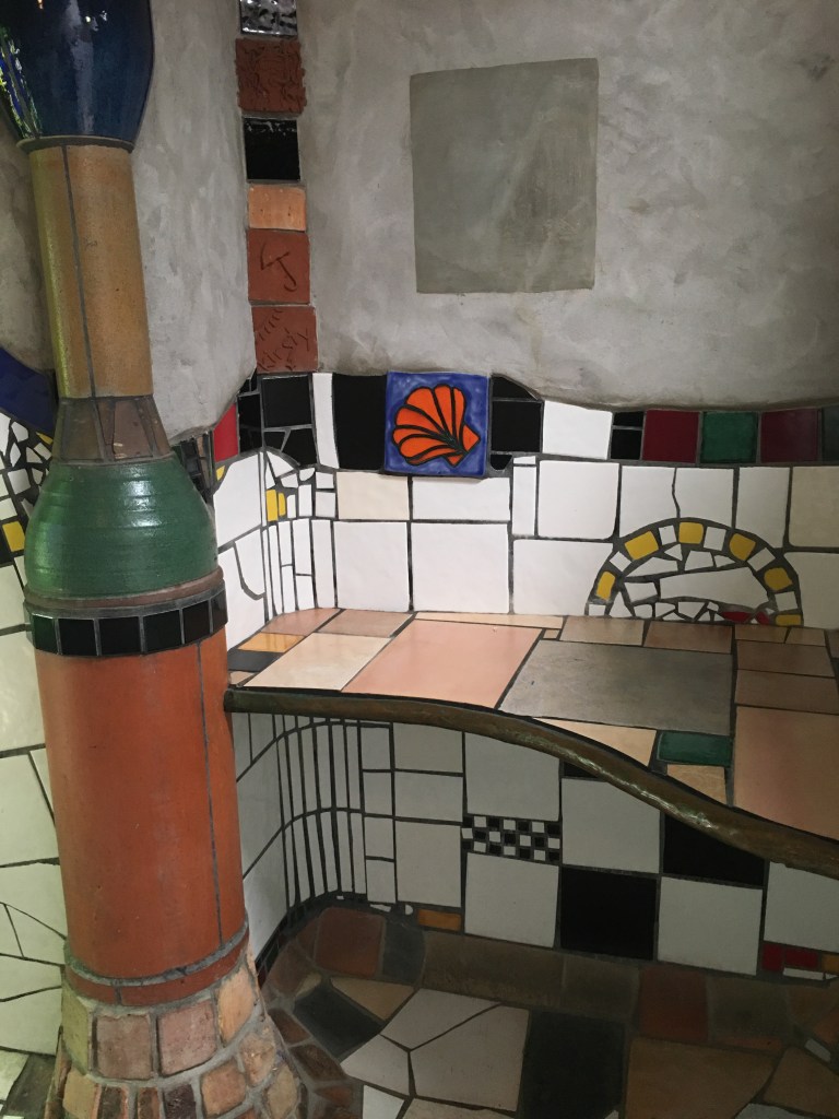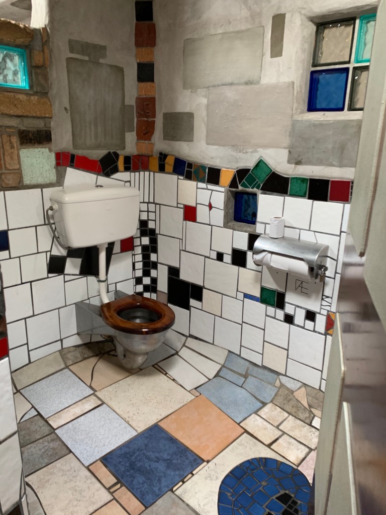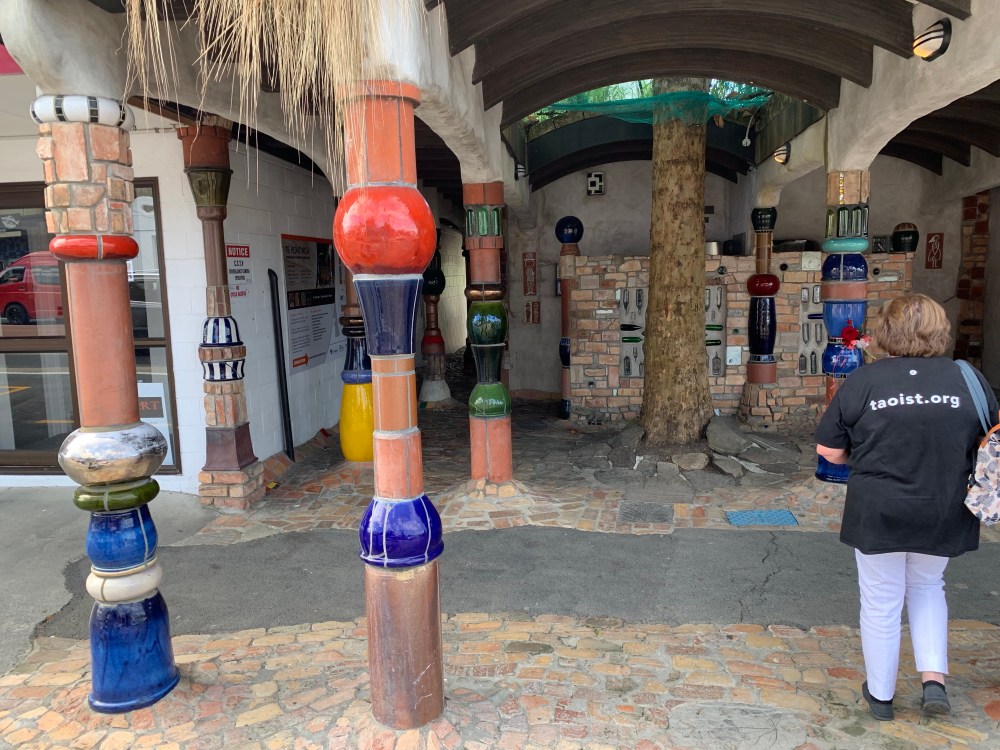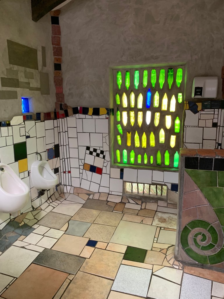 The next morning we had an adventure in Auckland getting the screen on Wendy’s phone repaired (and she complains that I don’t get her anything special for her birthday!) and then headed ever north stopping only at the most excitingly avant garde and kitsch public toilets imaginable at a place called Kawakawa. I can only imagine the state of the previous public toilets if an eccentric and reclusive Austrian Eco Architect called Friedensreich Hundertwasser thought the only thing he could do to help was to rebuild them.