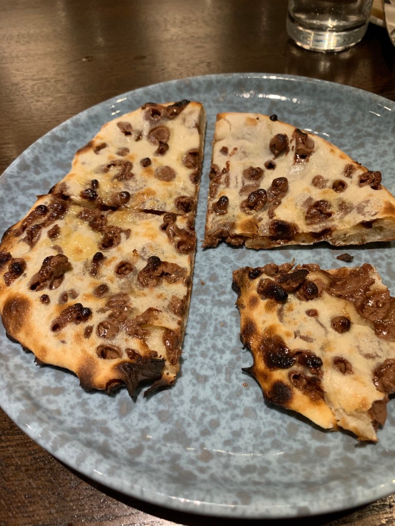 There was a birthday cake and then the best surprise ever. One of the waitresses said that she could ask her mate in the kitchen for one of his “specials”. [Now, at this point I am so tempted, as I know you are, to go down the Kenneth Williams road e.g. “but I said we would like to finish dinner first” etc etc, but I won’t]. We immediately both agreed and she returned a few minutes later with … chocolate naan! [I know, I know, it gets ever more tempting..].