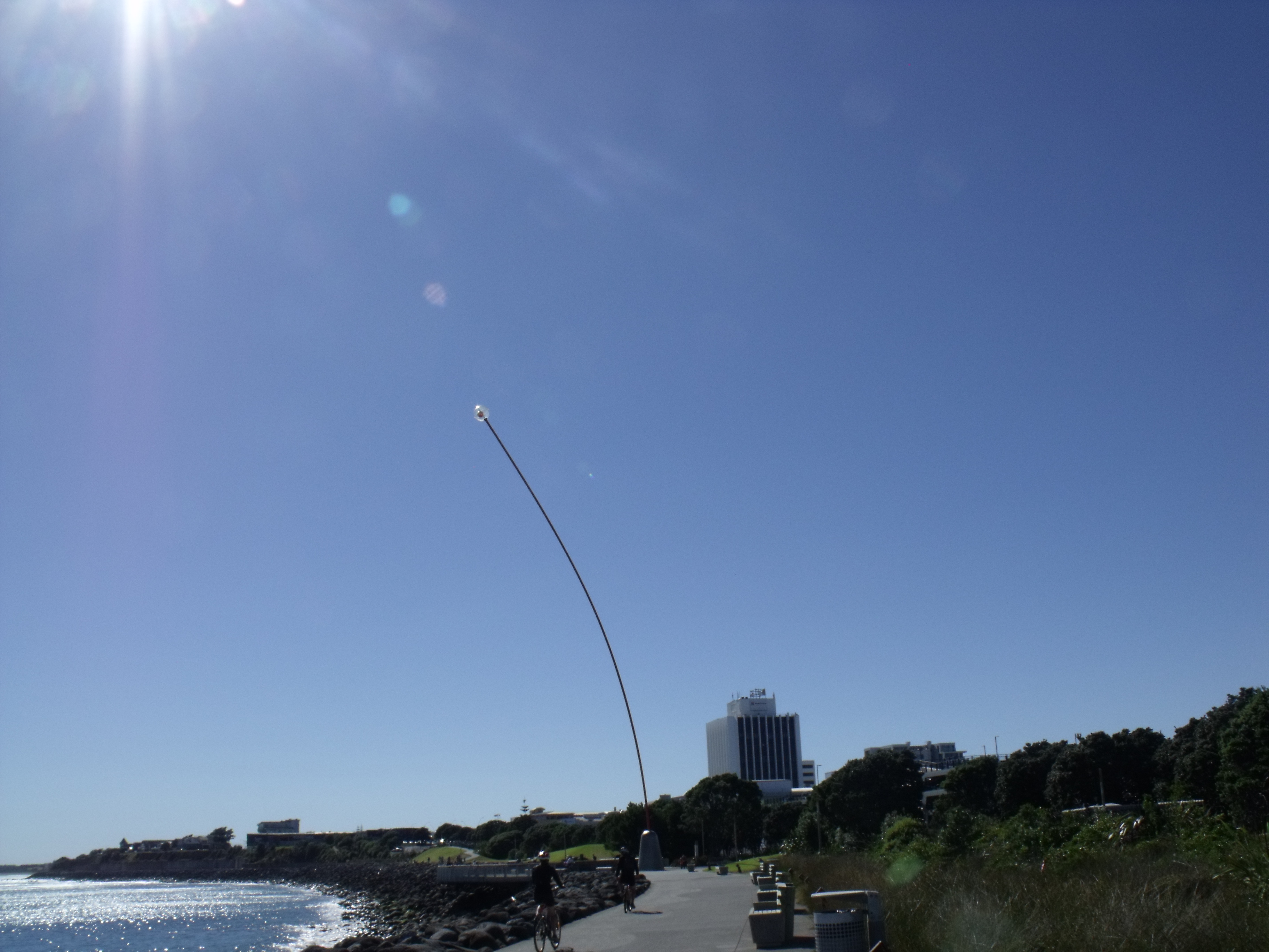 Those of you with a more earth science background will have immediately spotted that Mt Taranaki is a volcano and not classified as extinct either. Our real destination was the town of New Plymouth sitting just to the right of the mountain in the photo. I chose New Plymouth kind of randomly but then we discovered that it was the birthplace of one of the most respected modern New Zealand artists – Len Lye – a film maker, a kinetic sculptor, writer and painter who worked in the USA and London in the 1950s and 1960s becoming one of the most influential artists of his generation. His most famous piece was just outside the gallery in New Plymouth, the Wind Wand, all 45m of it: